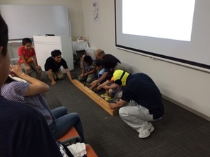 こどもさん3人と目隠しをした大工さん(代表の松本です)とのくぎ打ち競争