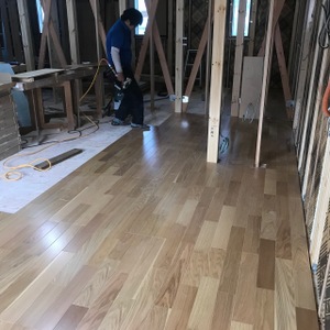 外壁工事が始まると見た感じは完成も近く思われますが、内部はフローリングを貼ってます。