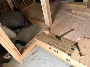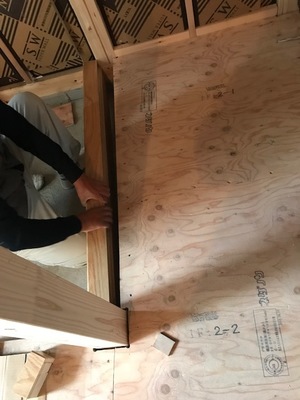 屋内ではフローリング貼にむけて玄関框取付、代表施工中です。