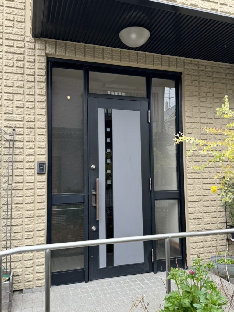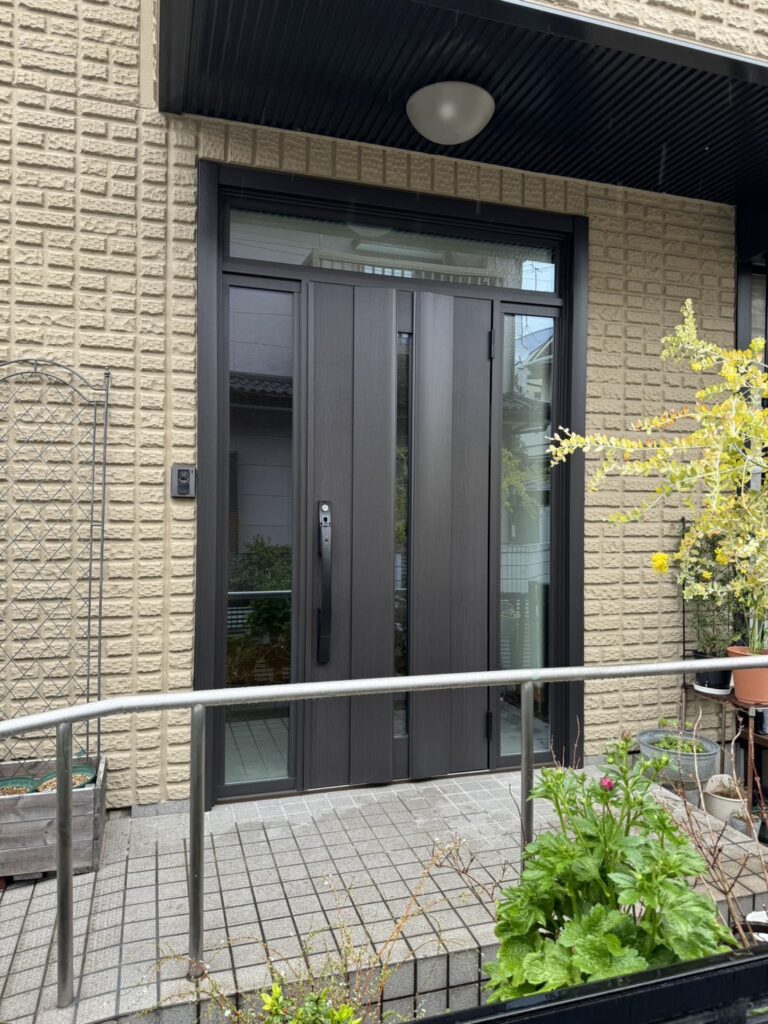 今回採用したのは、LIXILの「リシェント」です。リシェントは一日で工事が終了するのでお客様のご都合にも合わせやすい工事になっています◎ 今回リフォームさせていただいたお家は、玄関ドア下のタイルが一部補修が必要+電気錠設置のため、電気工事をしてもらうなど、玄関ドア設置以外の工事も出てきましたが、現地調査も入念に行い、無事に工事が完了しました✨